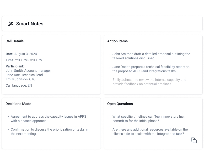 The system generates automated call notes in real time with critical details like action items, decisions, deadlines, and follow-ups. These AI-generated call summaries help you stay on top of every conversation effortlessly, so you can focus on what matters most—getting things done.
